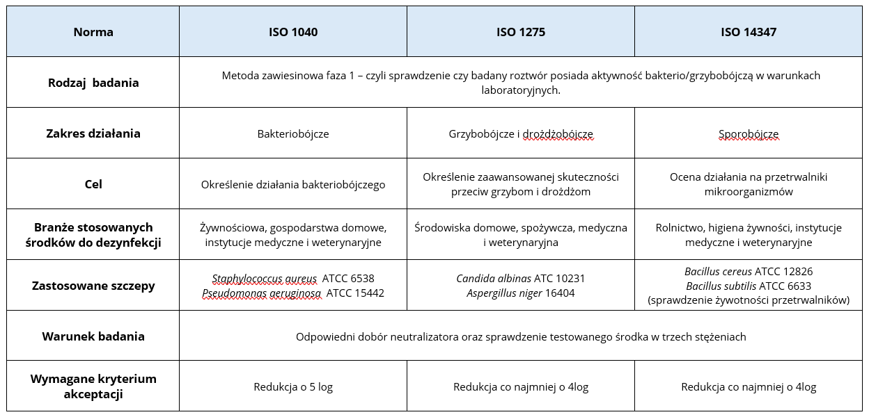 W praktyce porównujemy skuteczność preparatu wobec kluczowych grup drobnoustrojów, w oparciu o zestaw norm testowych: